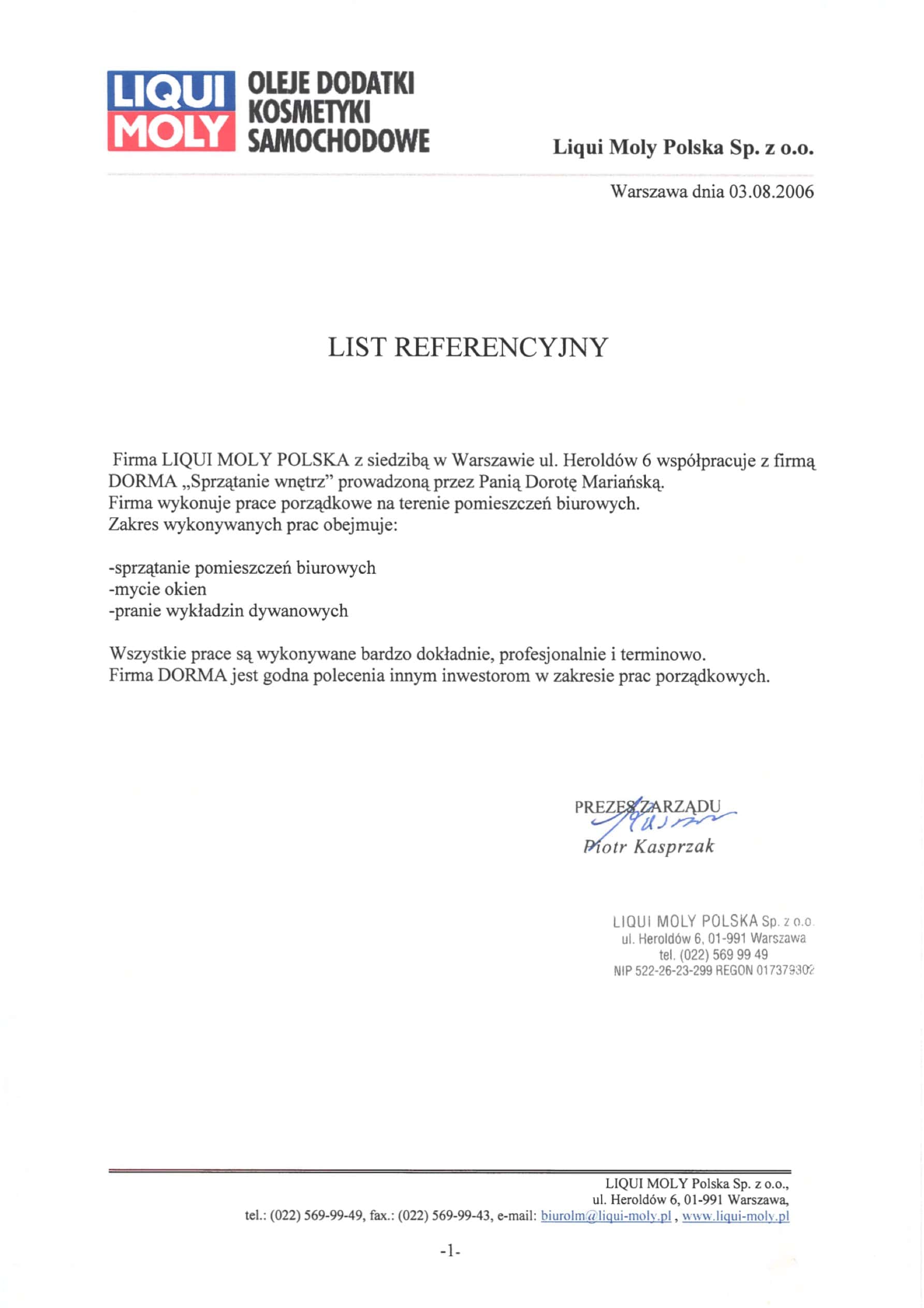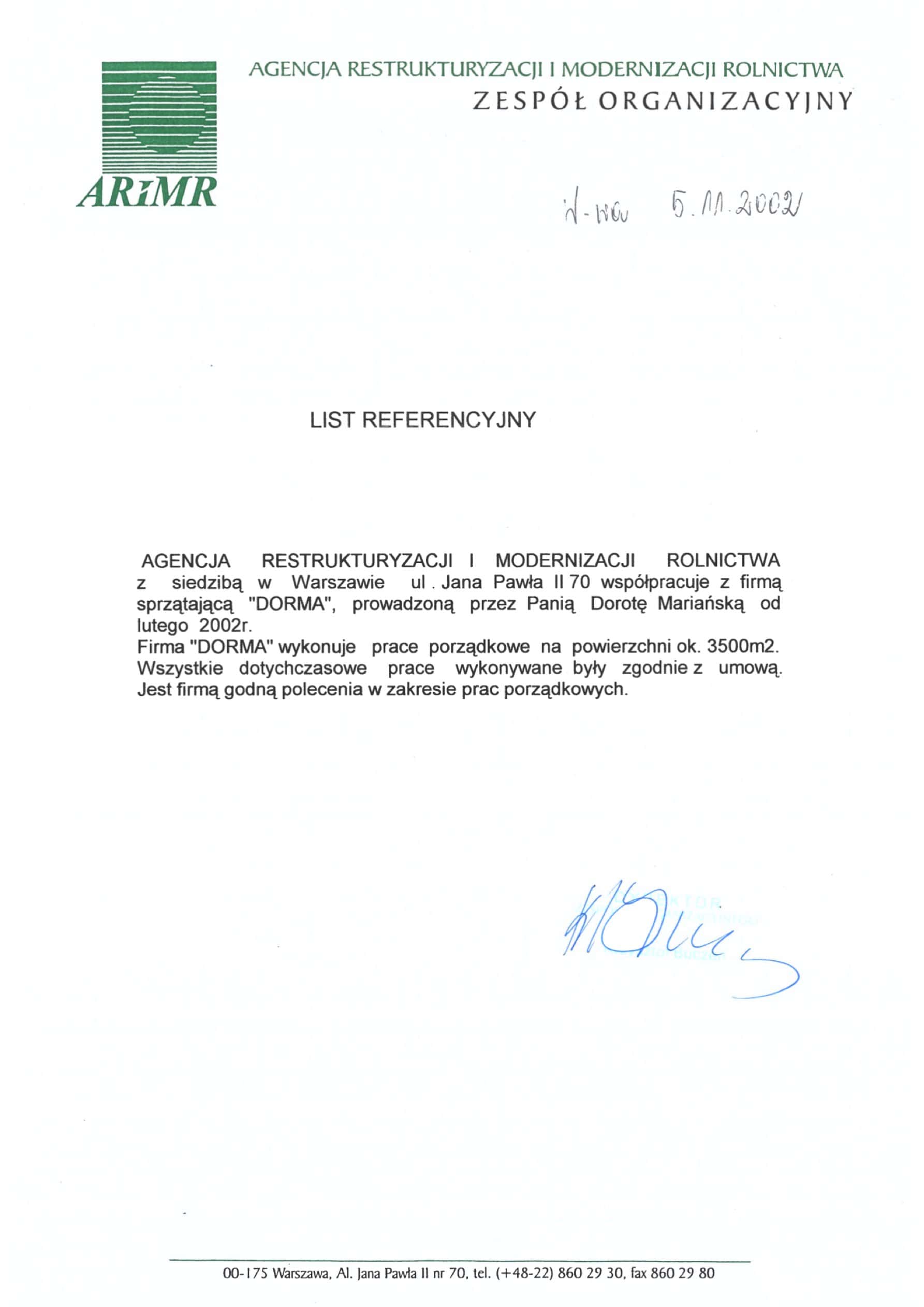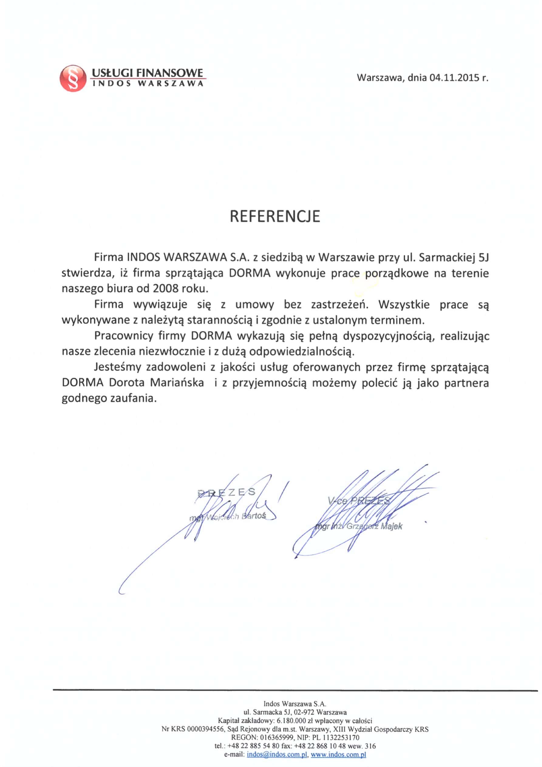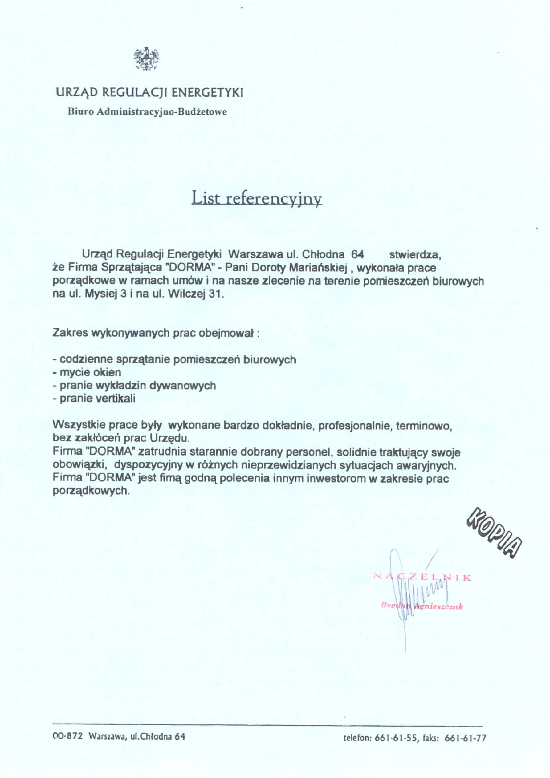 DORMA powstała w 1996 roku. Dzięki sumienności, dokładności oraz terminowości wyrafinowanych prac zyskaliśmy szacunek wielu przedsiębiorstw oraz instytucji budżetowych. Referencji firmie udzieliły m.in. następujące podmioty: